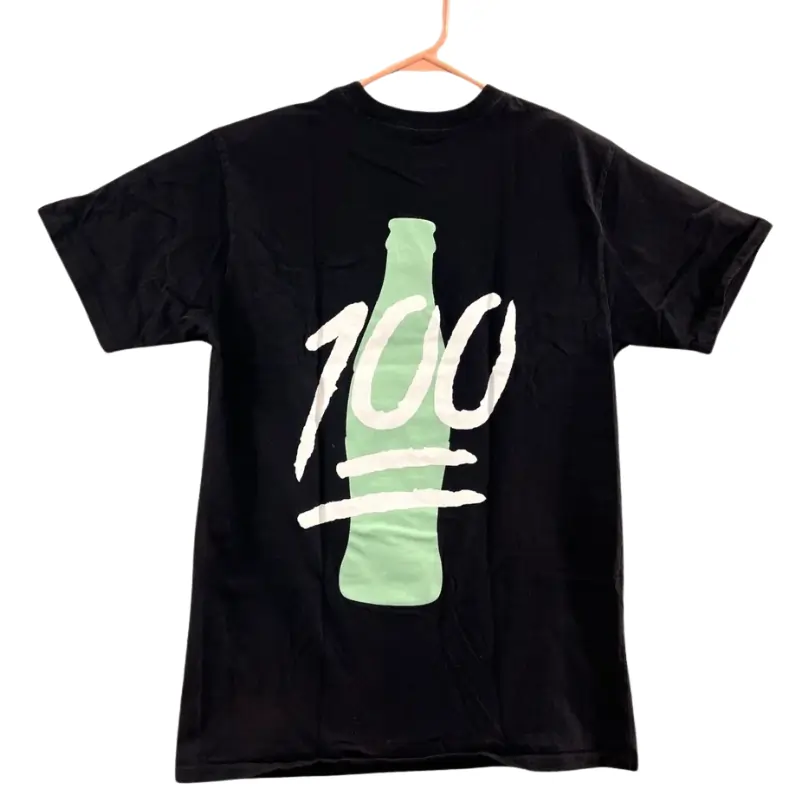 Reveal your style with our Black Been Trill x Coca Cola Graphic Logo T-shirt, where statement design meets a clean finish. The front shows a Coca-Cola logo and two hashtag grids, spaced to create a modern graphic feel. On the back, a light green bottle outline spans large, sliced horizontally by the number “100” in bold white print. This cotton-made tee is all about standout artwork and crisp detail, made for anyone who likes their fashion with meaning.