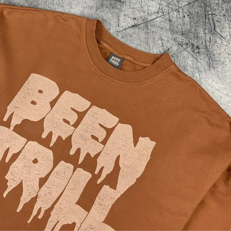 Our Brown Been Trill Logo Sweatshirt levels up any casual look. Made with pure cotton to keep it soft and easygoing from morning to night. A bold Been Trill logo takes center stage on the front, making a statement without trying too hard. Hashtags run down both sleeves, adding extra attitude from every angle.