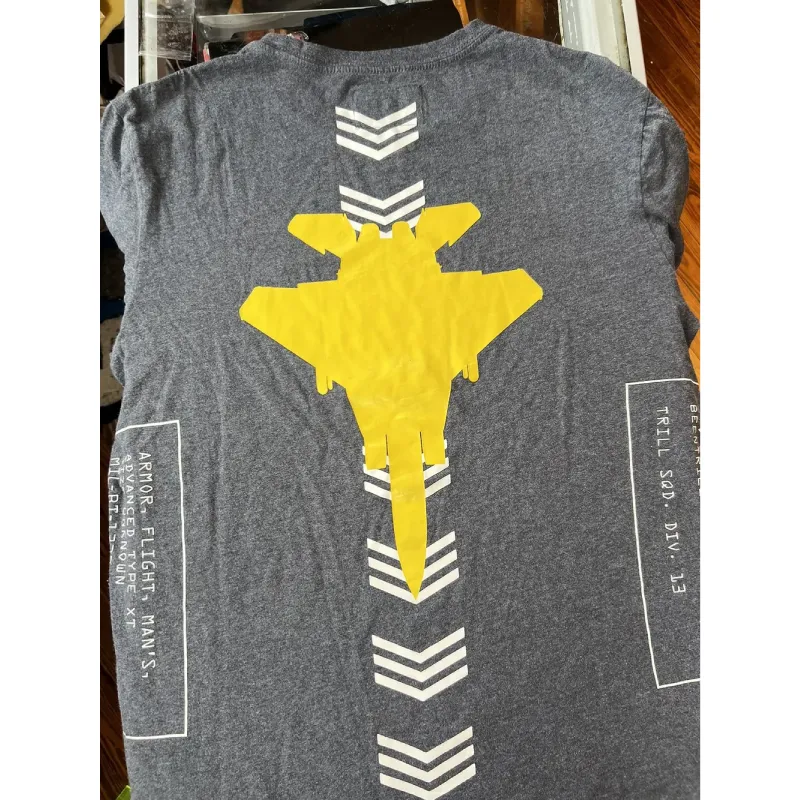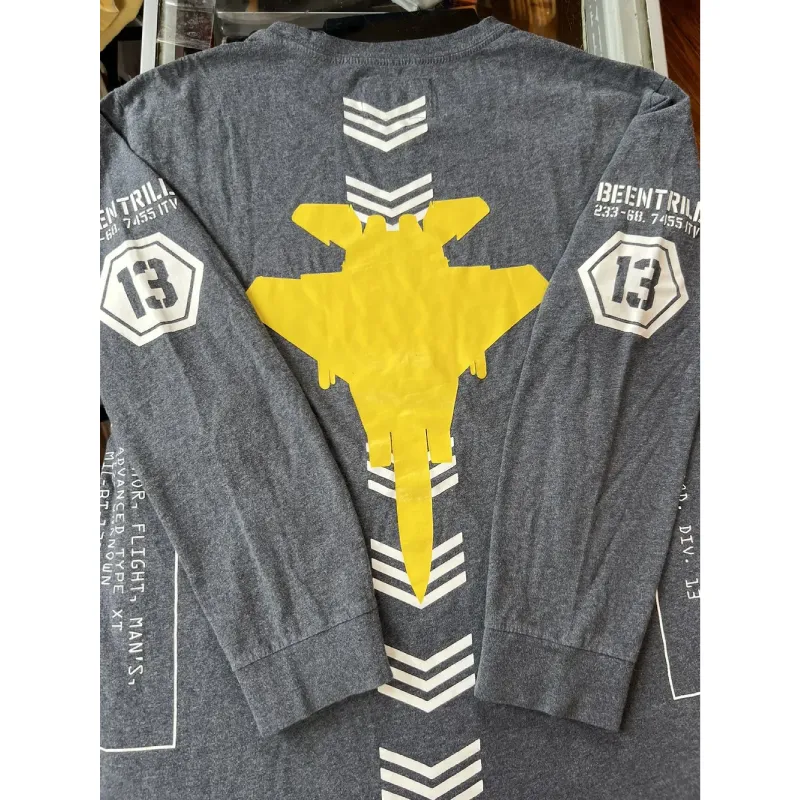 Our Grey Been Trill Fighter Jet Long Sleeve Tee makes no apologies for standing out. A front chest print in stark white sets the tone, with sleeve graphics that mix numeric codes and the signature “13” badge inside a hex. The back breaks all the rules with a vivid yellow aircraft design, bordered by clean white chevron lines.