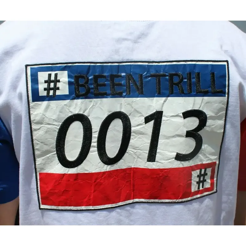 Layered chest prints add texture and edge. A subtle blue trim runs along the collar for a sharp finish. On the back, a distressed panel pushes boundaries with large numbers and a raw BEEN TRILL callout.
