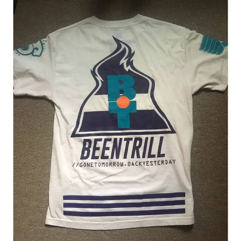 Flip it over, and the back steals the scene. Oversized BEEN TRILL artwork hits hard in navy and teal, stacked over layered stripes at the base. Classic crewneck build with a soft, solid feel that holds up strong.